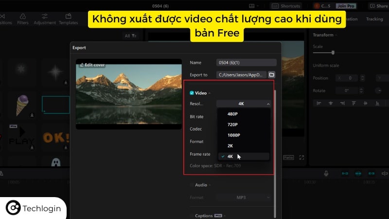 CapCut Free cho phép xuất video ở độ phân giải phổ thông. Một số hiệu ứng hoặc template có thể bị dính watermark hoặc bị hạn chế tùy chọn xuất.