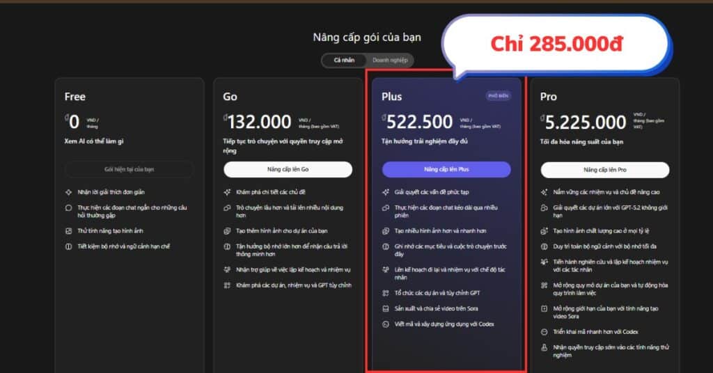 - Nâng cấp trên tài khoản cá nhân: phù hợp với người ưu tiên sự riêng tư và muốn quản lý gói ChatGPT Plus trực tiếp trên account của mình.